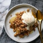 This Pear Ginger Crisp is a comforting dessert featuring thinly sliced D’Anjou pears glazed with lemon juice, maple syrup, and fresh ginger, all topped with a crunchy, spiced whole wheat oat crumble with walnuts. Baked to golden perfection and served warm with vanilla bean ice cream, it’s a perfect treat for any season combining fruity freshness with warm spices.