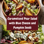 This Pear Salad features caramelized Bartlett pears, crunchy candied pumpkin seeds, and tangy blue cheese atop fresh frisée or romaine greens, all dressed in a honey vinaigrette. The contrast of sweet, savory, and crunchy textures makes it a sophisticated and refreshing salad perfect for a light lunch or as an appetizer.
