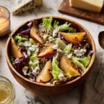 This Pear Salad features caramelized Bartlett pears, crunchy candied pumpkin seeds, and tangy blue cheese atop fresh frisée or romaine greens, all dressed in a honey vinaigrette. The contrast of sweet, savory, and crunchy textures makes it a sophisticated and refreshing salad perfect for a light lunch or as an appetizer.