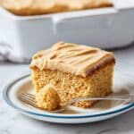 A square piece of moist, light brown cake with a smooth, creamy, tan-colored frosting layer on top, sitting neatly on a white plate with a blue rim. A fork rests on the plate, holding a small chunk of the cake with frosting, showing its soft texture. The background is a white marbled surface with a white, rectangular baking dish slightly blurred in the back. Photo taken with an iphone --ar 4:5 --v 7