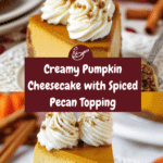 This Pumpkin Cheesecake combines a spiced pumpkin filling with a buttery graham cracker crust, baked in a water bath for a creamy, crack-free texture. Topped with a smooth cinnamon-cream cheese whipped cream and chopped pecans, it’s a festive and decadent dessert perfect for autumn celebrations.