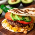 9. Assemble the Quesadilla Burger: Place a cooked burger patty on a cheesy tortilla, add canned corn, sliced jalapenos, tomato, and avocado slices as desired. Drizzle or spread chipotle mayo on top, then cover with another cheesy tortilla to create the quesadilla-style burger.