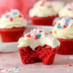 The image shows a close-up of red velvet cupcakes with one cupcake in the front having a bite taken out of it. Each cupcake has two main layers: the bottom layer is a bright red, moist cake with a soft, crumbly texture, and the top layer is white cream cheese frosting, thick and swirled in a decorative way. The frosting is topped with small heart-shaped sprinkles in pink, white, blue, and red colors. The cupcakes are placed on a light pink wooden surface with a white marbled texture in the background. Photo taken with an iphone --ar 4:5 --v 7