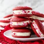 Five red velvet whoopie pies are stacked on a white plate over a red crocheted cloth with a white marbled surface beneath. Each whoopie pie has two soft, round, deep red cake layers with a smooth, thick layer of white cream filling in the middle. The cream filling is decorated with small red, pink, and white heart-shaped sprinkles along the edges. The background is bright and white with a white marbled texture. photo taken with an iphone --ar 4:5 --v 7