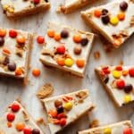 Keywords: Reese’s Pieces, peanut butter, white chocolate, bark, no bake, easy dessert, holiday treat, candy bark