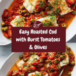 This Roasted Cod with Burst Tomatoes and Olives is a flavorful and elegant seafood dish perfect for a weeknight dinner or special occasion. Tender cod fillets are oven-roasted to perfection and complemented by a vibrant, buttery sauce featuring burst cherry tomatoes, briny olives, capers, fresh lemon juice, and fragrant dill. Served alongside crusty bread, rice, or grains, this recipe offers a deliciously balanced meal bursting with Mediterranean-inspired flavors.