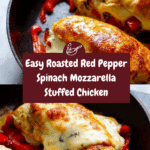 This Roasted Red Pepper Spinach Mozzarella Stuffed Chicken recipe features juicy chicken breasts filled with a flavorful mixture of roasted red peppers, fresh spinach, garlic, and melted mozzarella cheese. Searing the chicken first adds a beautiful golden crust, and finishing it in the oven ensures tender, perfectly cooked meat. This dish offers a delicious combination of savory, cheesy, and fresh vegetable flavors, making it an impressive yet easy-to-make main course.