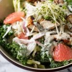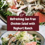 A vibrant and refreshing San Fran Chicken Salad featuring tender pan-seared chicken breast, massaged kale, crisp lettuce, tangy pickled onions, juicy citrus segments, and a creamy yoghurt ranch dressing infused with fresh herbs and garlic. This healthy and colorful salad is perfect for a nutritious lunch or light dinner.