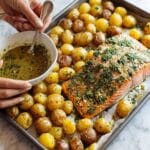 This Sheet Pan Salmon with Dill Potatoes recipe features perfectly roasted baby gold potatoes infused with garlic and dill alongside a tender, flavorful salmon filet topped with a tangy Dijon-mayo spread. Cooked entirely on one sheet pan, it’s a quick, easy, and elegant meal with minimal cleanup and maximum flavor.