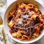 - Serve: Spoon the ragu-coated pasta into shallow bowls. Garnish with freshly shredded parmesan cheese. For an elevated presentation, add a pinch of fresh burrata, flake sea salt, and chopped fresh basil on top.
