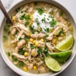 This Slow Cooker White Chicken Chili is a comforting and flavorful dish featuring tender chicken simmered with aromatic spices, green chilies, beans, and corn. Perfect for an easy weeknight meal, it combines the zest of cumin and coriander with creamy cannellini beans, topped off with optional garnishes like Monterey jack cheese, lime, cilantro, and sour cream for a satisfying and hearty chili experience.
