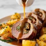 - Serve: Remove the kitchen twine from the lamb and slice the roll into 2 cm (0.8 inch) thick slices. Arrange on a platter surrounded by the roasted potatoes. Spoon over gravy, optionally sprinkle chopped pistachios and garnish with rosemary sprigs. Serve with sautéed green beans for color and freshness.