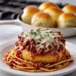 Spaghetti Garlic Bread Bowls combine two comfort food favorites into one delicious meal. Hollowed-out crusty rolls are filled with rich meat sauce spaghetti and topped with melted cheese, making a fun and hearty dish perfect for family dinners or casual gatherings.