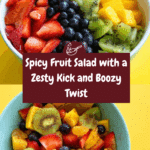 A vibrant and zesty Spicy Fruit Salad combining fresh mango, kiwi, strawberries, and blueberries, enhanced with lime juice, a hint of chili powder, and optional sweetness and boozy accents for a refreshing and flavorful treat.