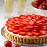 This elegant Strawberry Champagne Tart features a crunchy vanilla wafer crust filled with a smooth, creamy champagne-infused mascarpone filling and topped with fresh strawberries glazed with a champagne glaze. Perfect for celebrations or a sophisticated dessert, it combines light, refreshing flavors with a silky texture.