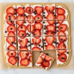 This image shows a rectangular snack cut into many small square pieces and placed on brown parchment paper over a white marbled surface. The base layer is a white creamy spread, smooth in texture. On top, there are many thin, bright red slices of fresh strawberries arranged evenly on each piece. Scattered across the whole snack are small, dark brown chocolate chips, adding texture and contrast. The pieces are cut cleanly but one piece is mostly missing from the center. Photo taken with an iphone --ar 4:5 --v 7