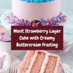 Keywords: strawberry layer cake, strawberry cake, layered cake, buttercream frosting, pink cake, homemade cake, birthday cake, berry dessert