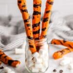 Tigger Tails are a fun and festive treat perfect for parties and themed celebrations. These marshmallow sticks are layered with gooey caramel, coated in vibrant orange candy melts, and finished with a drizzle of rich dark chocolate for a delightful combination of flavors and textures.