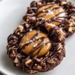 Store these cookies in an airtight container at room temperature for up to 3 days. For longer storage, keep them refrigerated for up to a week, but allow them to come to room temperature before serving. The chocolate drizzle will harden nicely, and the caramel will remain soft and gooey. Avoid freezing as it may change the texture of the caramel.