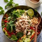 This refreshing Vietnamese Chicken Salad features tender cooked chicken combined with crisp wombok cabbage, crunchy vegetables, fresh herbs, and a zesty, tangy dressing. Tossed with a vibrant lime, fish sauce, and chili dressing, and topped with crunchy roasted peanuts, this salad is perfect as a light meal or side dish bursting with authentic Asian flavors.