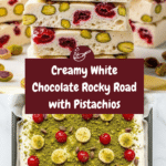 Keywords: white chocolate, rocky road, no-bake dessert, marshmallows, pistachios, glacé cherries, holiday treat, easy dessert