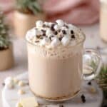 A clear glass mug filled with a thick, creamy light beige drink topped with a layer of white marshmallows scattered with small dark chocolate chips. The mug sits on a white marbled texture, with small white chocolate pieces and chocolate chips around its base. In the background, there are blurred small green pine branches in beige holders and a pink cloth. Photo taken with an iphone --ar 4:5 --v 7