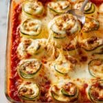 - Assemble roll-ups: Spread a thin layer of marinara sauce on the bottom of a 9″ x 13″ baking dish. Take each zucchini strip and spread a thin layer of the ricotta mixture on top. Spoon a little marinara sauce over the ricotta, then sprinkle with some mozzarella cheese. Carefully roll up the zucchini slices and place them seam-side down in the baking dish, packing them tightly together.